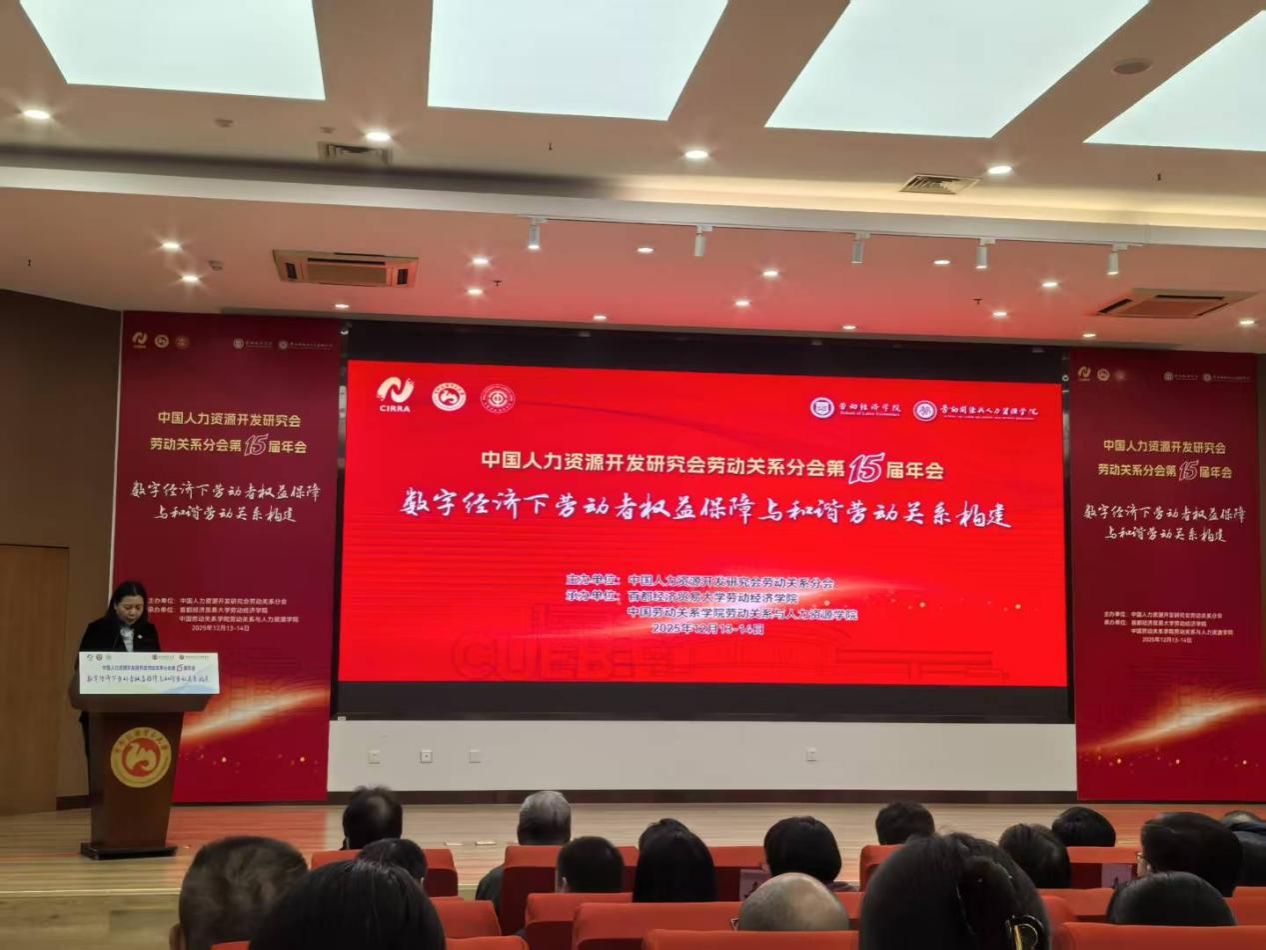 2025年12月12日至15日,由中国人力资源开发研究会劳动关系分会主办,首都经济贸易大学劳动经济学院和中国劳动关系学院劳动关系与人力资源学会共同承办的中国人力资源开发研究会劳动关系分会第15届年会在北京召开。来自全国百余所高校、科研机构及实务部门的百余名专家及代表共同围绕“数字经济下劳动者权益保障与和谐劳动关系构建”主题,进行交流与探讨。我院劳动经济与劳动政策研究所谢鹏鑫副教授作为受邀专家参加了此次会议,并在分论坛进行了专题报告。