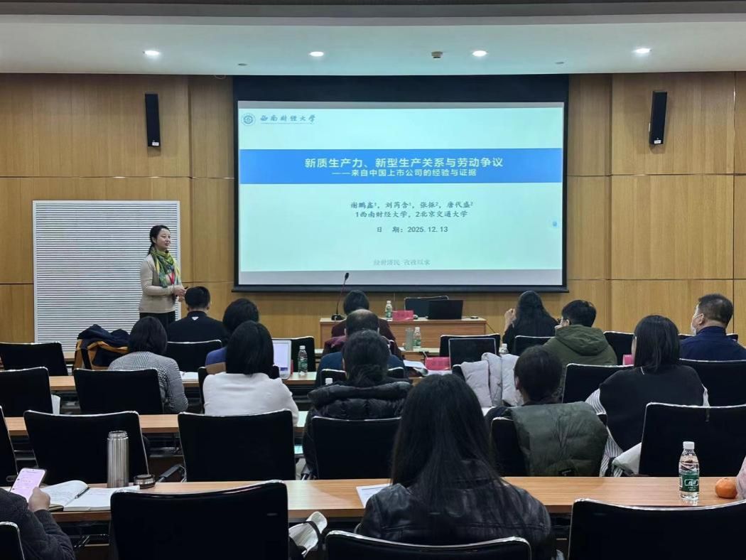 本次会议包含六场大会主旨报告、五场分论坛、期刊编辑面对面、圆桌论坛等多个环节。在下午的分论坛一“数字经济与劳动关系前沿发展”中,谢鹏鑫做了题为《新质生产力、新型生产关系与劳动争议——基于中国上市公司的经验与证据》的报告。该研究聚焦新质生产力发展对劳资关系的影响,探究其如何通过塑造与之相适应的新型生产关系,进而缓解劳动争议。研究揭示了新质生产力对于降低劳动争议的重要作用,为加快形成适应新质生产力发展要求的新型生产关系,构建和谐劳动关系提供了有益的经验借鉴和政策参考。汇报结束后,与会专家对该研究进行了深入细致的精彩点评。