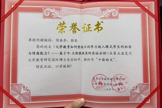 该研究提出,除知识与技能外,社会与情感能力已成为当代大学生的重要核心素养。然而,从“中-大衔接”的视角探讨高中学习投入及大学教育环境对其影响的研究仍相对有限。研究发现,高中阶段学习投入具有四种潜在类型:“高投入型”“独立型”“中投入型”和“低投入型”;方差分析显示,各群体学习投入特征由高中延续至大学,形成较为稳定的“学习投入模式”,并在大学阶段的社会与情感能力的表现与发展上呈现分层趋势。分样本回归结果显示,大学的课程与教学实践、校园文化氛围、学业评价制度等方面因素对不同学习投入模式学生社会与情感能力的预测作用既具共通性,也呈差异性:实践活动和大学校风学风对各学生群体均有显著正向预测作用;高投入型与中投入型学生的社会情感能力与三方面的大学教育要素都正向相关,而低投入型和独立型学生的相关能力则主要与促进人际交流与高阶认知参与的教育因素相关。研究揭示了高中与大学学习经验之间的延续性关联,为推动高中与大学协同培养学生的社会与情感能力提供了实践启示。最后,该论文获得“十佳论文”荣誉证书。