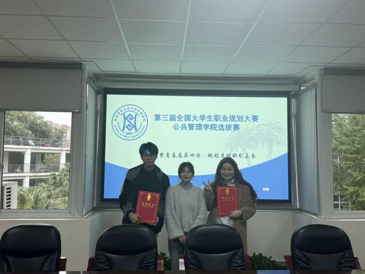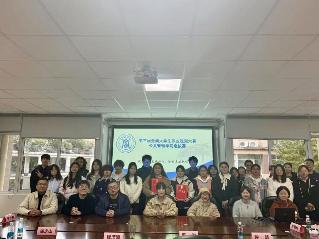 11月18日下午,第三届全国大学生职业规划大赛公共管理学院选拔赛在柳林校区通博楼A320会议室举行,社会保障系系主任穆滢潭、公共经济制度与政策研究所所长何欢、行政管理系教师潘少杰、劳动经济与劳动政策研究所教师钟慧、教育政策与管理研究所教师张娟、辅导员任平、黄艳玲、李世界担任评委,各年级学生代表到场观摩。
